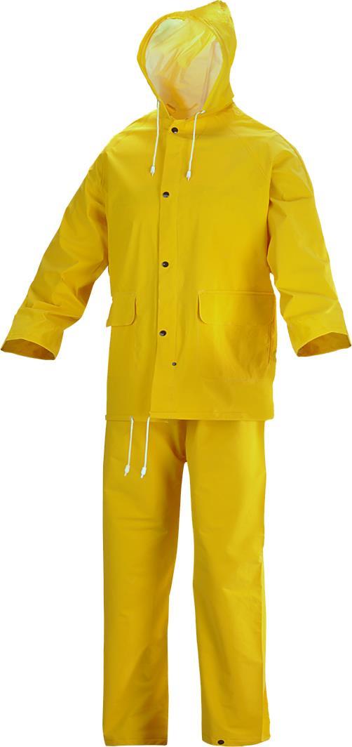 BeschrijvingRegenpak met capuchon, windvanger in de mouw en elastiek om de middel.KwaliteitPVC/PolyesterKleurenGeelMatenM t/m 3XL