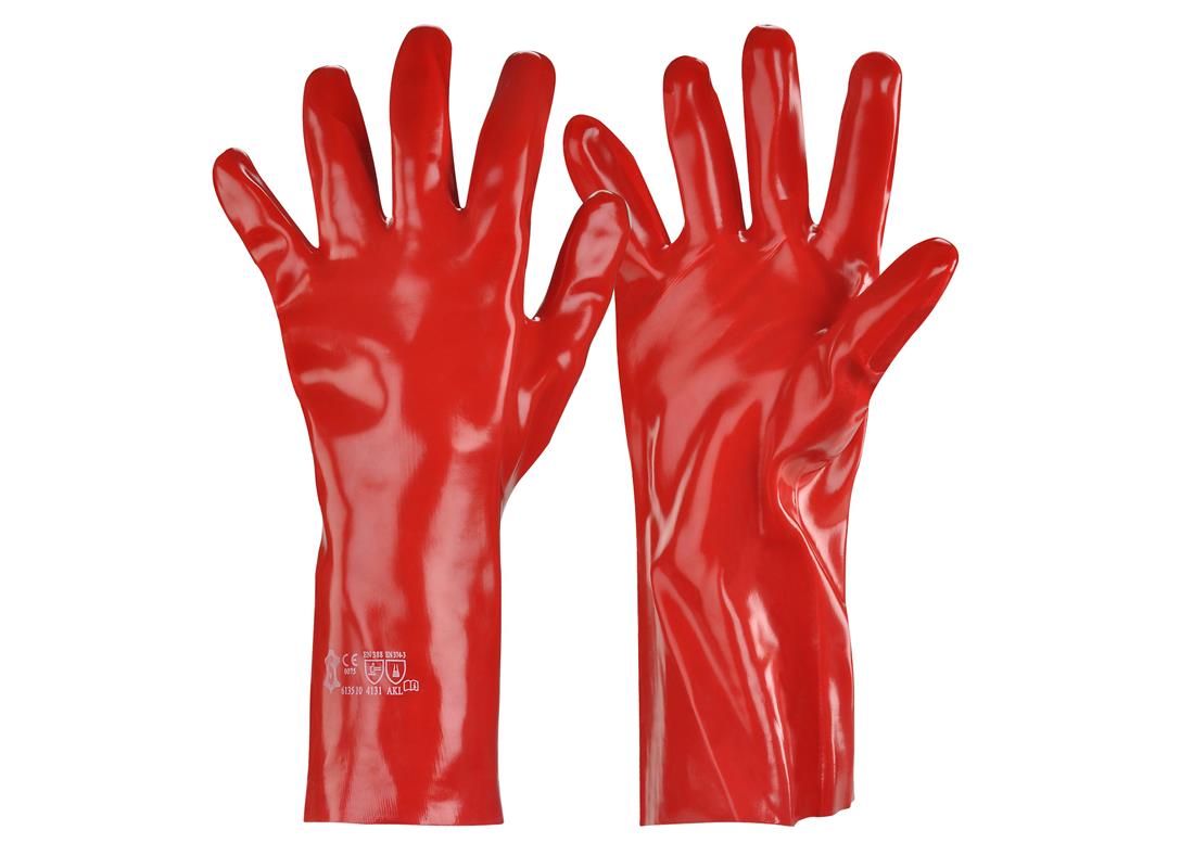 Rode chemisch bestendige handschoen van pvc. Lengte 27 of 35 cm.