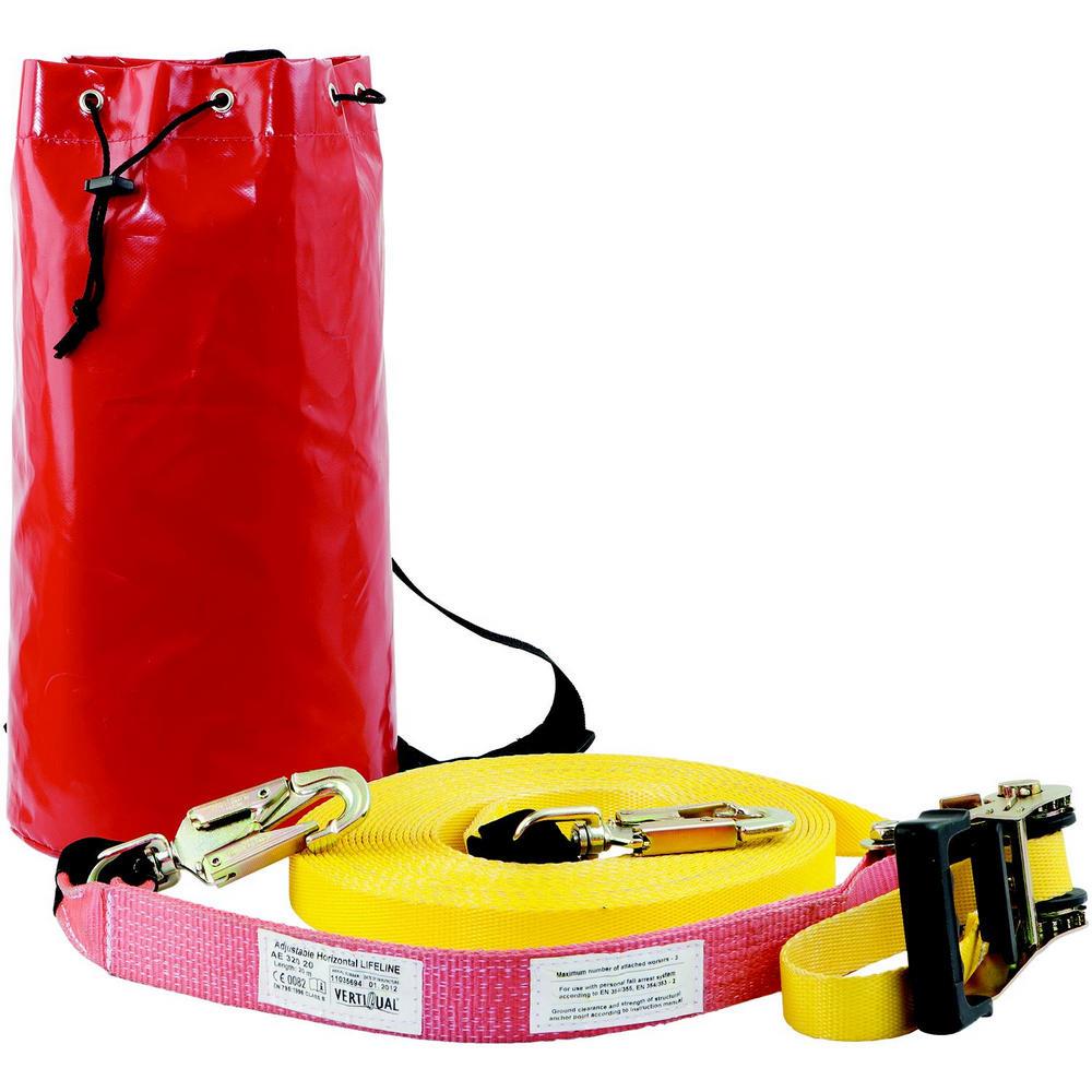 BeschrijvingTijdelijke horizontale verankeringslijn t.b.v. maximaal 3 personenLengte 20 meterKwaliteit24 mm PES bandStalen zwenkhaak aan beide uiteindenMet palwielNormenEN 795/B
