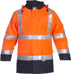 De Midi Parka High Vis Bicolor is onderdeel van de 20/20 Vision collectie. Naast een optimale zichtbaarheid biedt deze jas door de EN 343 klasse 3/1 certificering ook bescherming tegen neerslag (regen, sneeuw), mist en vochtigheid van de grond. De jas heeft een afneembare capuchon, maar is ook op te bergen in de kraag voor de veiligheid. De diverse zakken zorgen voor voldoende opbergruimte. Een logo is gemakkelijk te bedrukken of borduren door de printerrits. De rug wordt bij het bukken tijdens de werkzaamheden bedekt door het verlengde achterpand, welke tevens inklapbaar is. De tricot manchet met duimgaten biedt extra bescherming en warmte voor de handen. De onderkant van de jas is middels een koord aan de binnenzijde naar wens te verstellen. Deze parka heeft een gewatteerde voering en heeft een kort model tot op de heupen. De Midi Parka High Vis Bicolor is verkrijgbaar in drie verschillende bicolor kleurcombinaties, waaronder ook onze nieuwe kleurcombinatie fluor-red ink!