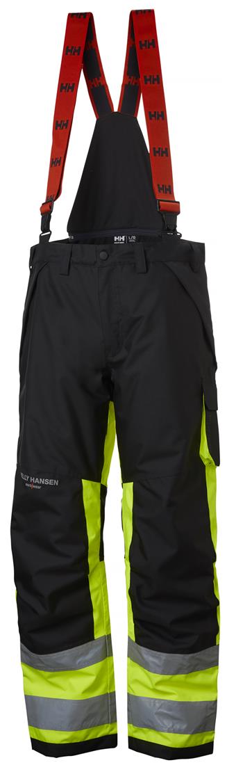 H-Vis winterpant met reflecterende band rondom het lichaam, twee hangende zakken met schuine hoek en dubbele bodem aan voorzijde voor spijkers/schroeven, twee hangende achterzakken met schuine hoeken, voor gereedschap, zak voor mobiele telefoon.