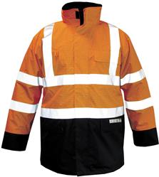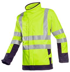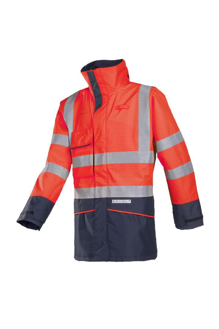 Vlamvertragende en antistatische parka voorzien van rechtopstaande kraag, kap apart verkrijgbaar, ritssluiting onder beleg met klittenbandsluiting, 1 opgezette borstzak, 2 opgezette zakken met klep, 2 lussen voor gasdetectiemeters, 1 Napoleon zak, rond ingezette mouwen, mouwvernauwing d.m.v. klittenbandsluiting, koord in zoom, waterdicht getapede naden, vlamvertragende reflecterende banden (50mm), ruglengte 85 cm. Jas wordt zonder voering geleverd