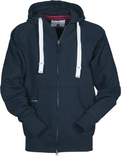 Herenhoodie met doorlopende geplastificeerde SBS-rits met dubbele metalen runner, capuchon met dubbel gestikte naden en wit trekkoord met contrasterend stiksel en metalen ringen, raglanmouwen, kangoeroezakken, kleine zak met rits, ribboorden met stretch aan de zoom en mouwen, versterkte naden.