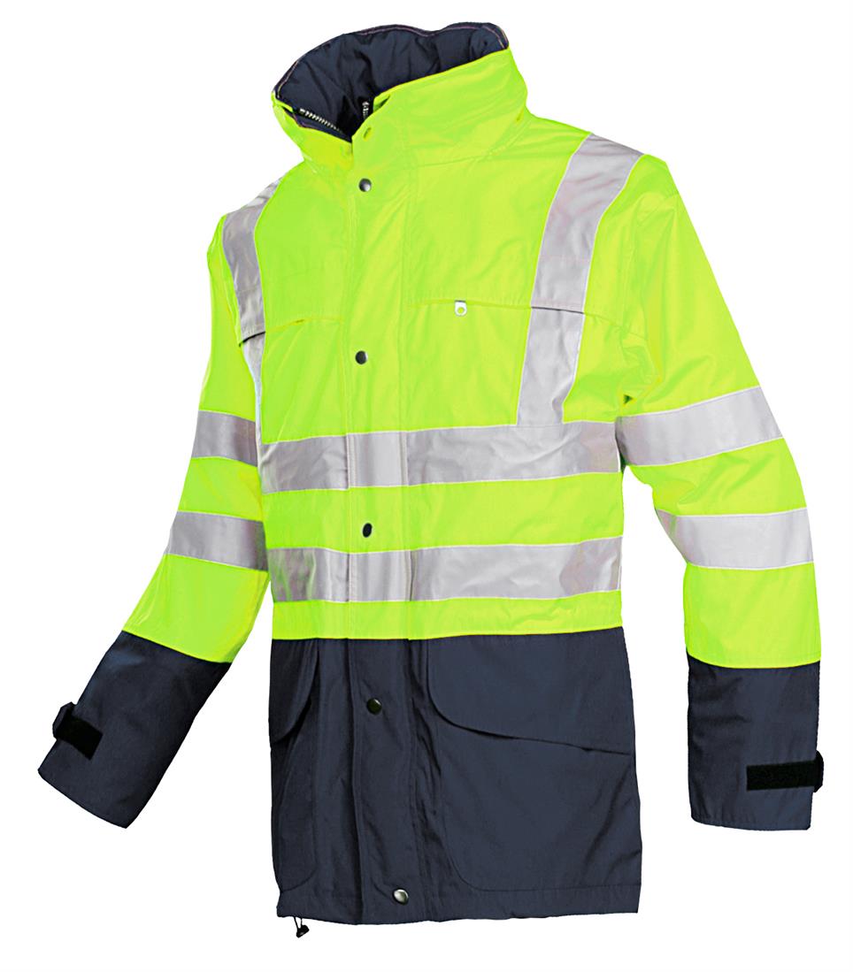 Siopor signalisatie parka, kap in kraag met koord, kinbescherming met klep, vaste meshvoering in kap, ritssluiting onder flap met drukknopen, 2 borstzakken met ritssluiting, binnenzak, telefoonzak, onderarmventilatie, 2 zakken met ritssluiting, mouwvernauwing dmv klittenband, naden waterdicht getaped, meshvoering in lichaam, nylonvoering in mouwen, elastische koord in lenden en onderaan jas, ruglengte 81cm.Mogelijkheid om fleece 131Z (fleece Reims) in te ritsen.