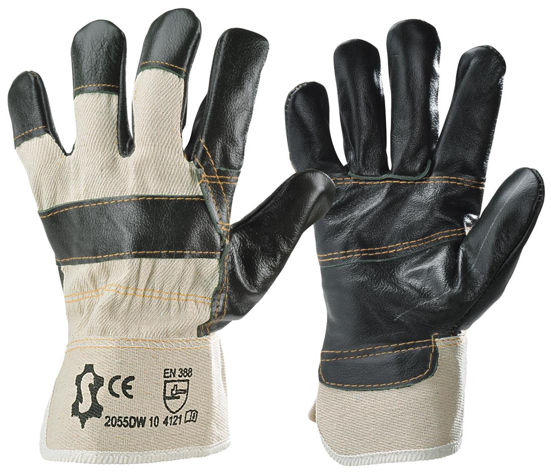 Handschoen van meubelleder in donkere kleur met palmversterking, rug en kap in wit katoen.