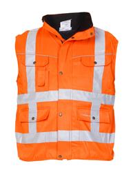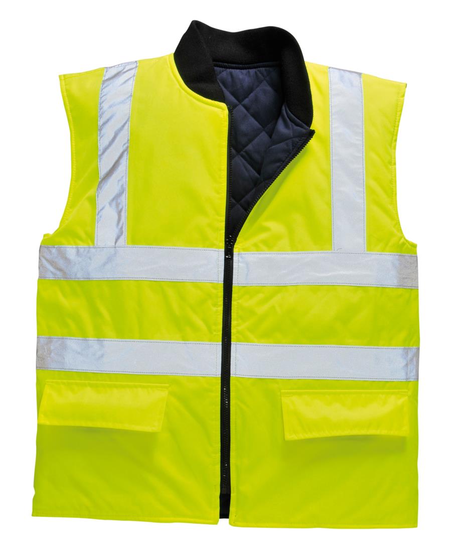 Omkeerbare bodywarmer met reflecterende tape, twee voorzakken met klittenband met klep, gebreide kraag, ritssluiting.