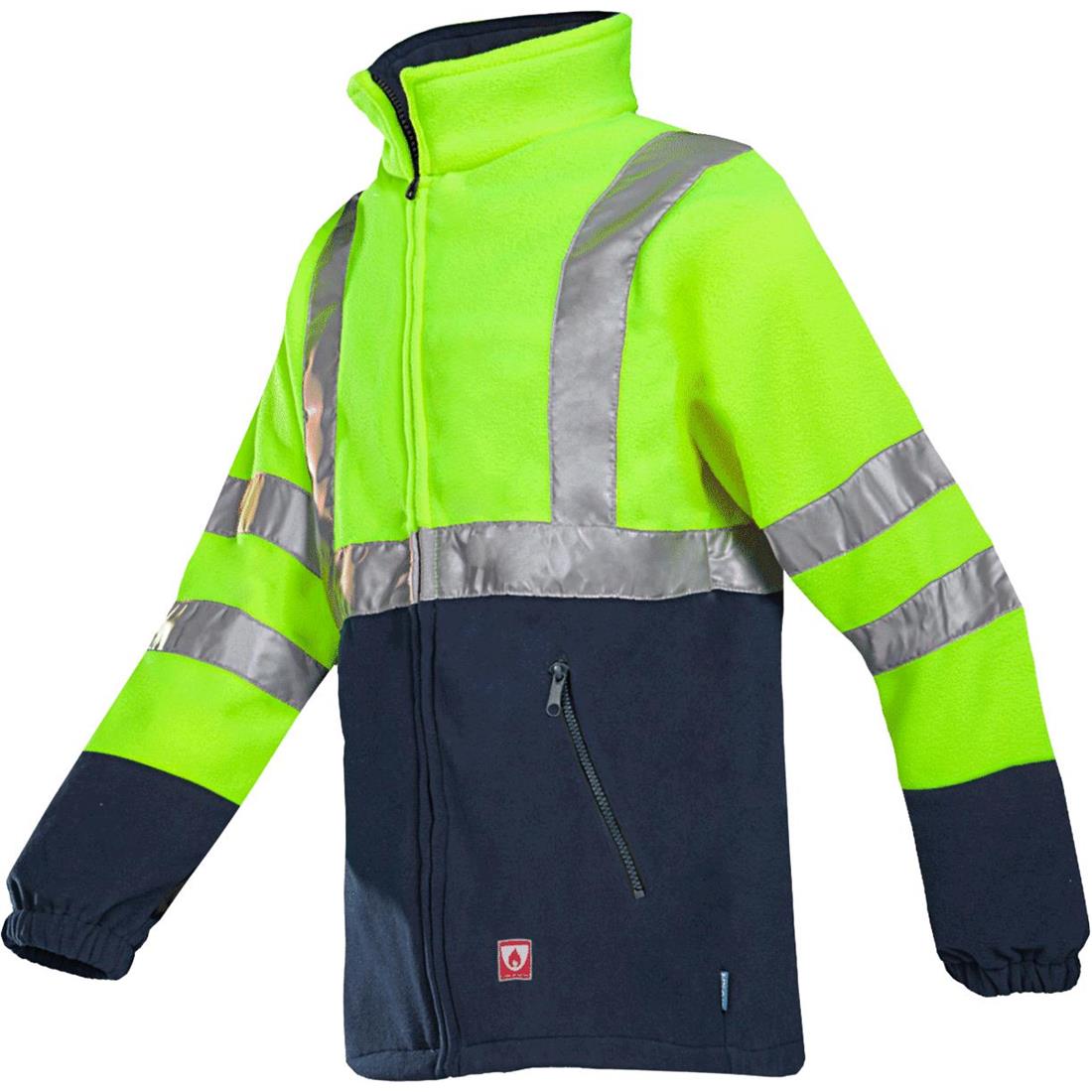 Vlamvertragende en antistatische signalisatie fleece, rechtopstaande kraag, mouwvernauwing d.m.v. elastiek, 2 ingezette zakken met ritssluiting, ritssluiting, elastisch koord in de zoom, reflecterende banden, vaste vlamvertragende voering met binnenzak.